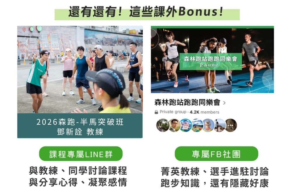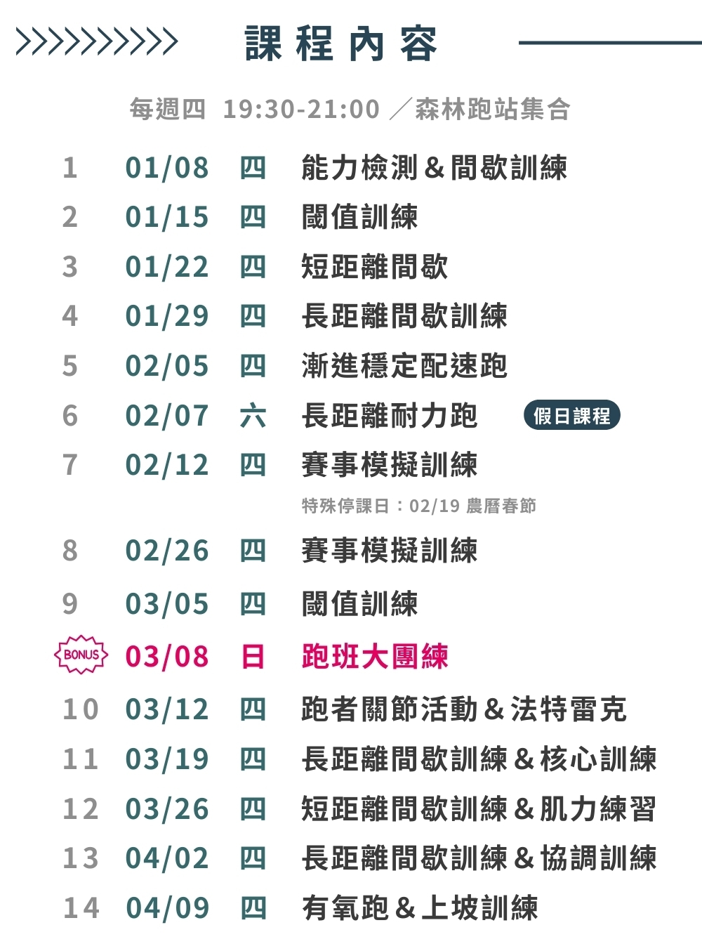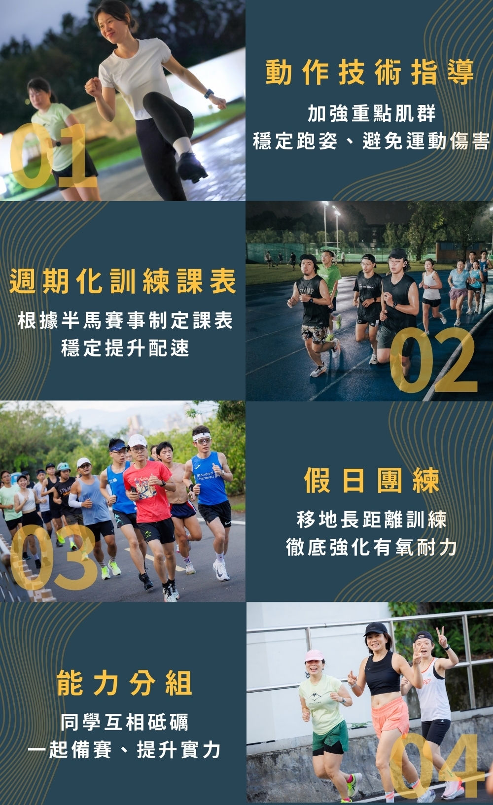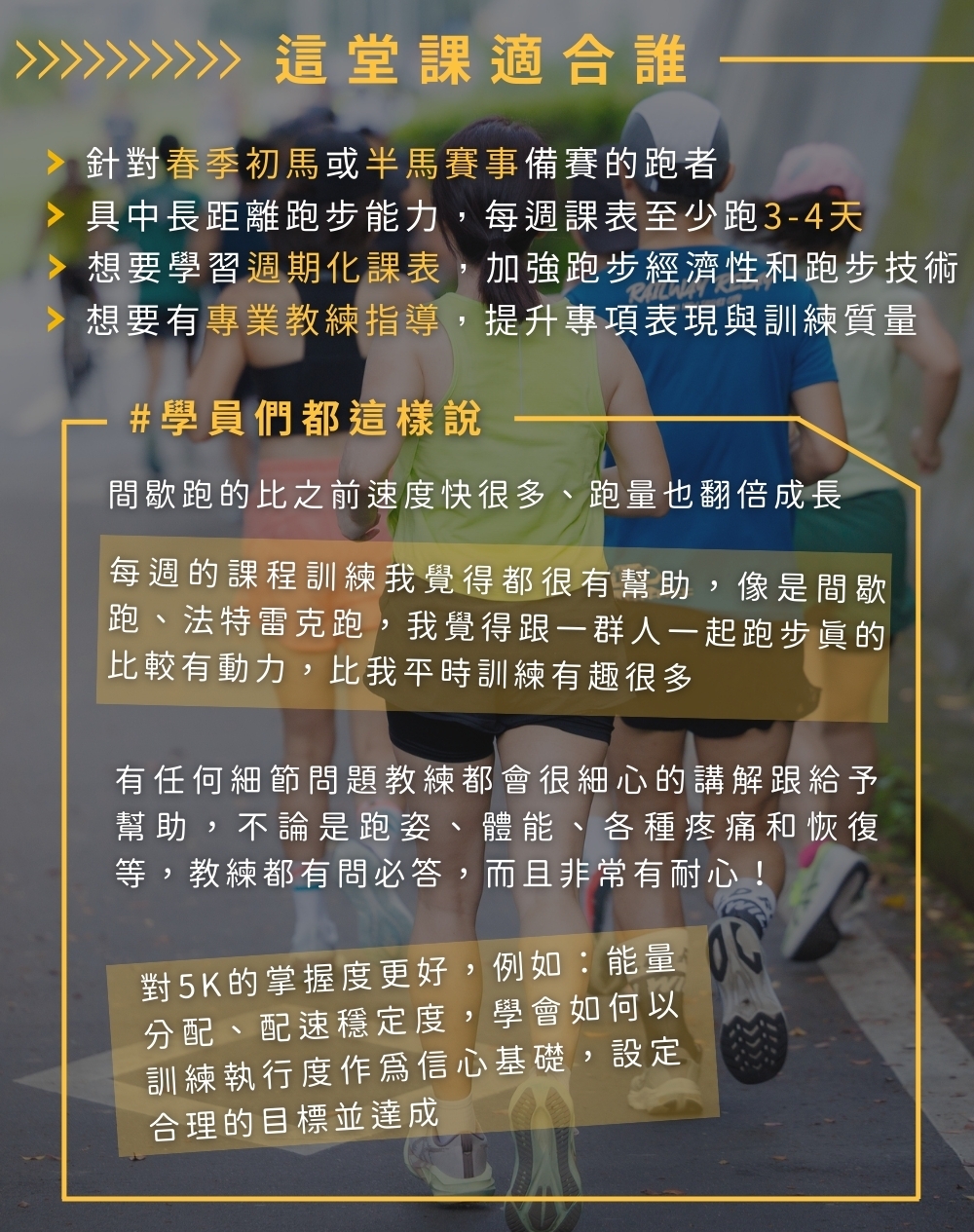 從冬季有氧打底、速度耐力提升、節奏控制到半馬配速策略,半馬突破班將一步步強化你的心肺、跑姿與節奏感,幫你在春季賽事突破自我!