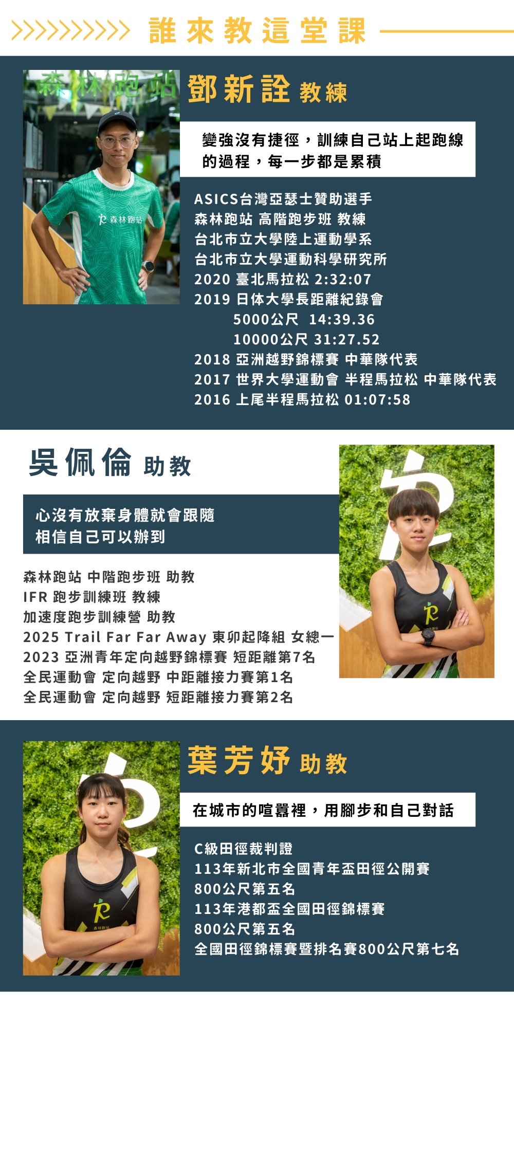 *依實際課表訓練安排和場地的不同,每堂課程時間約90-120分鐘 - 集合地點:森林跑站(台北市大安區新生南路二段60號)