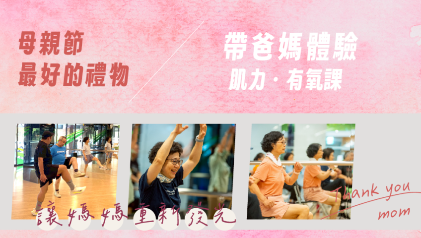 今年母親節不只吃飯!5月9日(六)上午,帶爸媽體驗趣味肌力課+活力有氧課,附身體檢測與恢復體驗。零門檻、零壓力,讓媽媽重新感受活力,健康才是最好的禮物。