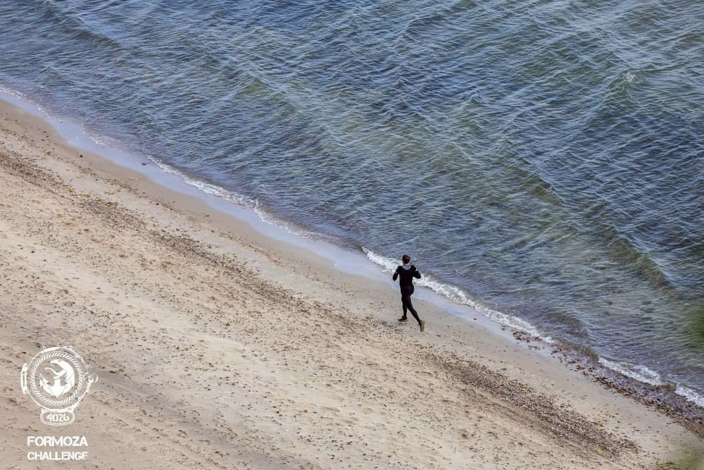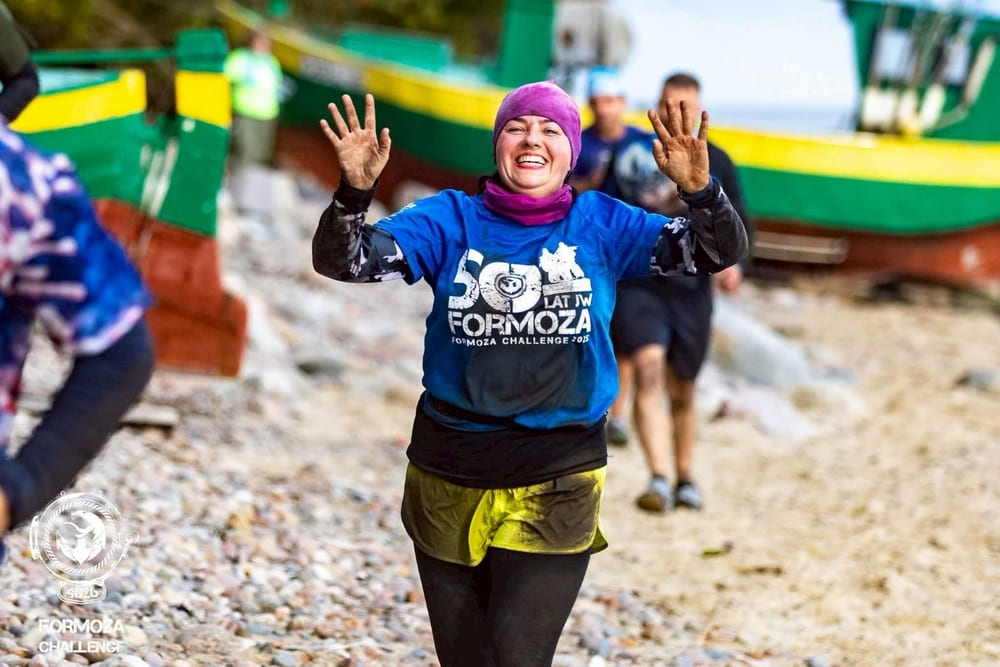 最令她印象深刻的,是賽道有一段直接把人帶進波羅的海:氣溫大約 10 度,跑者得下水,從岸邊走進海裡,再一路往前。途中不只是泡水——還要被橡皮艇上的人潑水、在口令下完成動作,如在海水裡做深蹲、弓步蹲走。